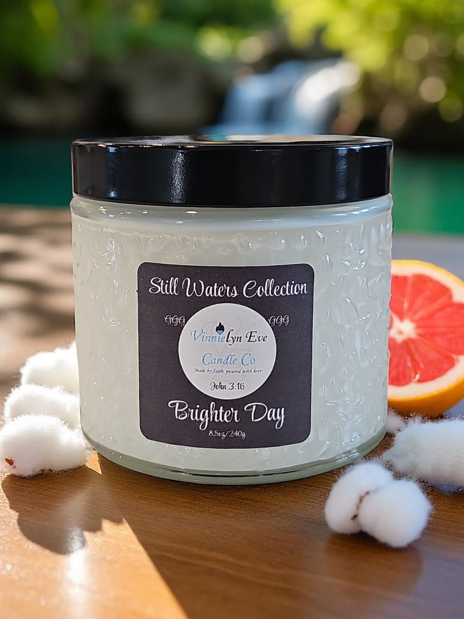 Experience the refreshing scent of clean cotton and zesty pink grapefruit with our Brighter Day candle. Let the crisp aroma fill your home and uplift your mood. This candle will bring a fresh and invigorating atmosphere to any space.