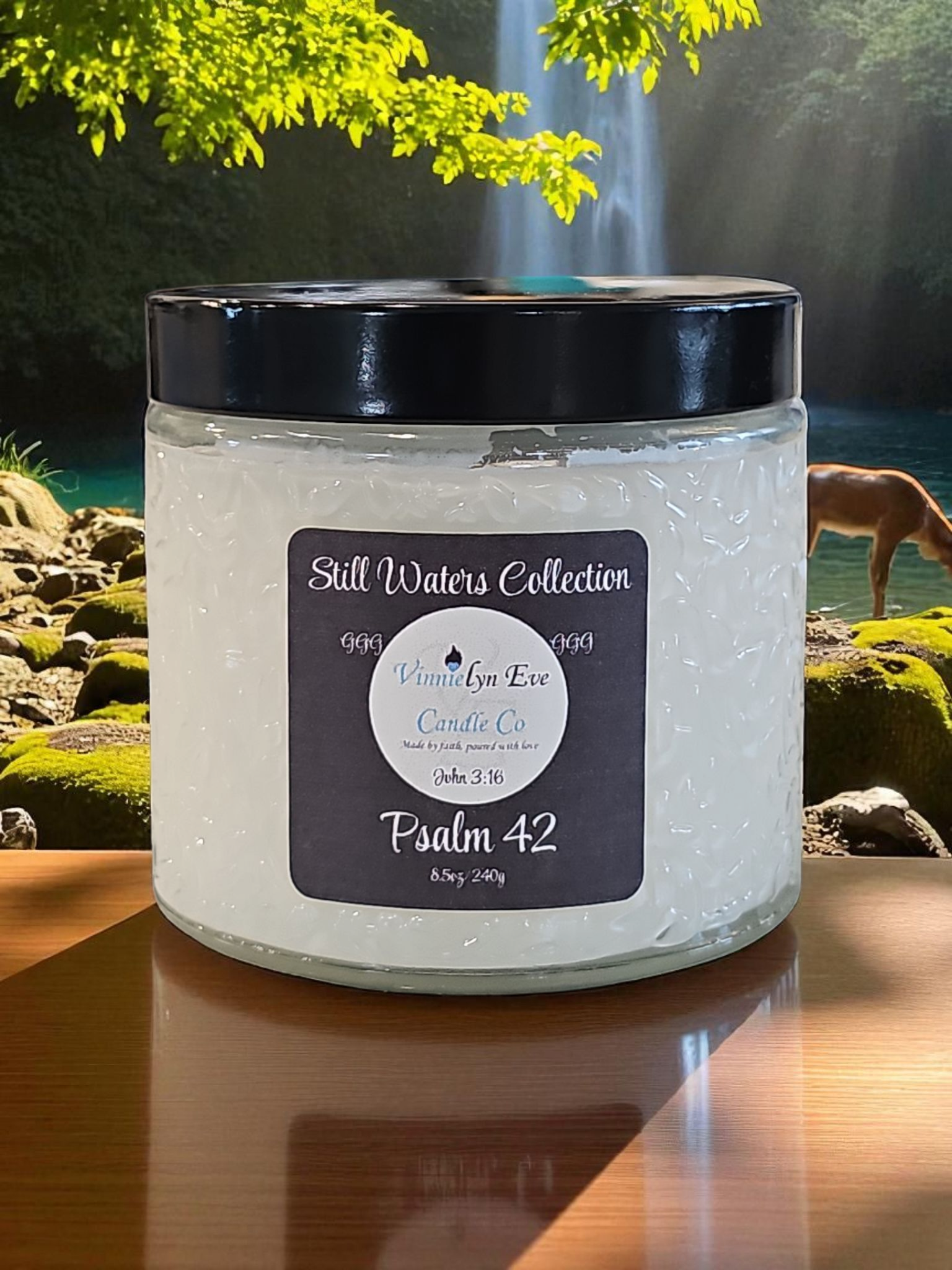 Psalm 42 features natural scents of cedar, pine, and moss. The aquatic base notes give you the feeling of being outdoors while relaxing by a peaceful brook. Let the gentle flicker of the candlelight enhance your relaxation and bring a touch of nature into your home. Try meditating on Psalm 42 and answer this question: Who does your soul long for?