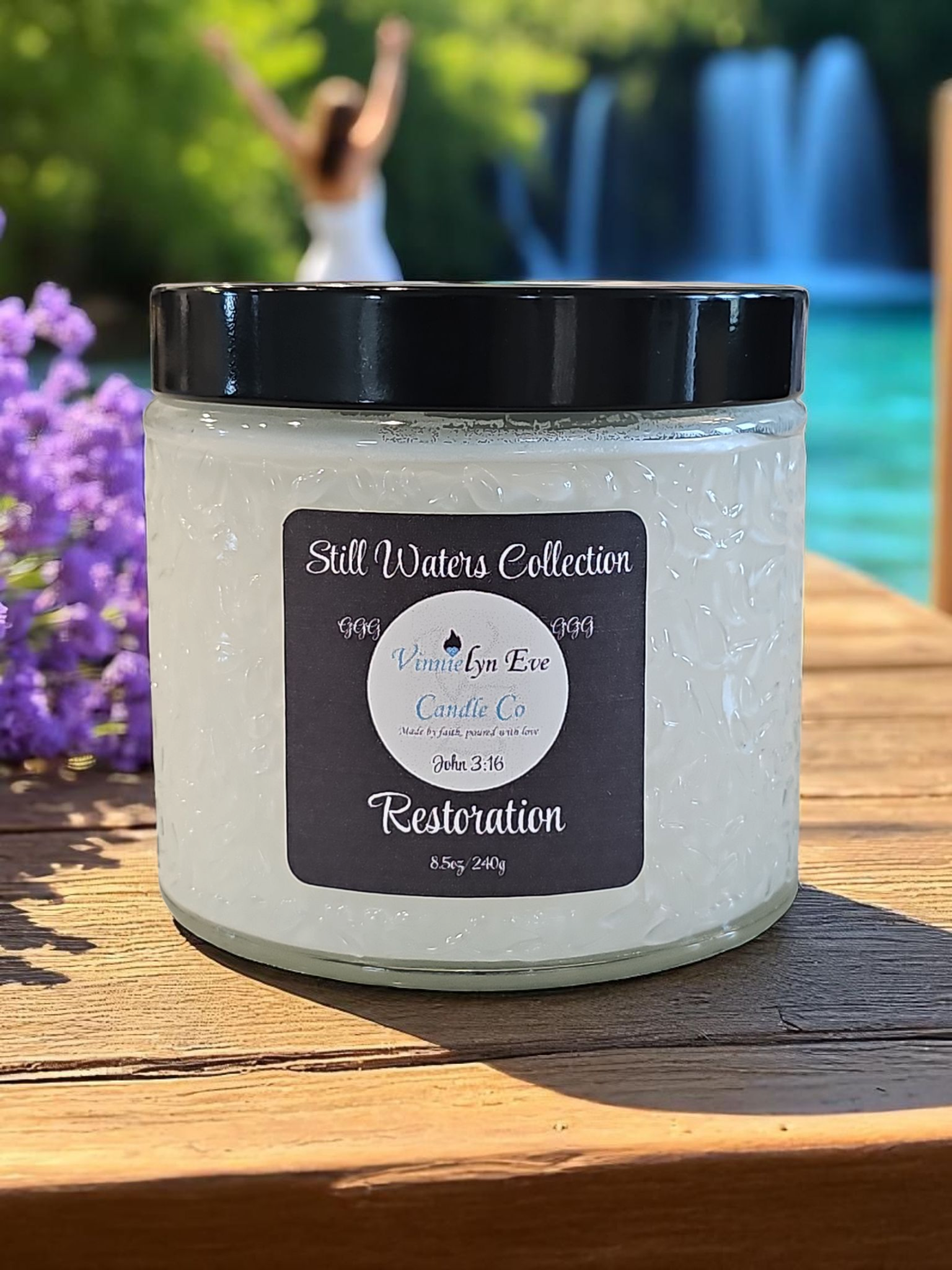 Relax and find inner peace with Restoration. Let the bold yet tranquil scent of sandlewood, coconut, and vetiver soothe your senses and create a calming atmosphere. Meditate on God's word and His goodness, then allow yourself to be restored with every burn.